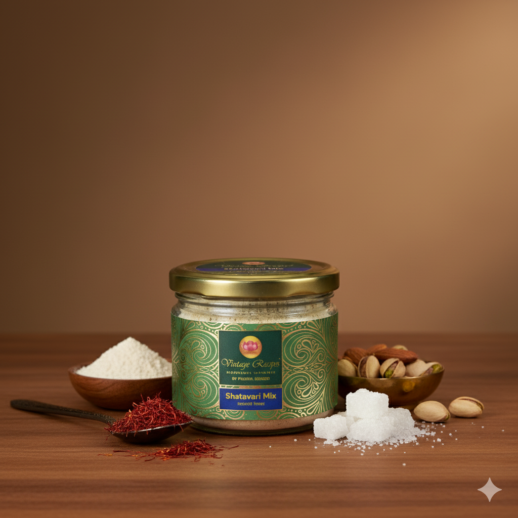 Our Shatavari Mix is a wholesome blend crafted to support postpartum recovery and lactation. Enriched with Shatavari powder, Kesar, almonds, pistachios, and Rock Sugar, this mix enhances vitality, balances hormones, and aids digestion. Ideal for new mothers, it helps restore strength, promote milk production, and boost overall wellness.